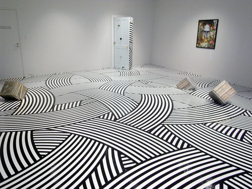 ジム・ランビーによって創り出されるインスタレーション空間は、床一面に規則正しいテーピングを施すことで生まれる幾何学的パターンによって空間を大胆に変容させ、人々に新たな視覚体験をもたらす。