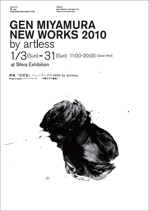 戦後より、文字の造形性や意味性との関わり合いに大きな混沌を抱え込んだ現代書に言及すべく、宮村弦は本展覧会において「イメージラング」というテーマを設定し、墨象作品からなる「読む抽象」という体験を提案する。そして、書に対する美意識を大胆に解釈し提示するため、グラフィックワークのために開発された「ピクトリコ・アートペーパー」を用いた書をグラフィックアートとして展開する。