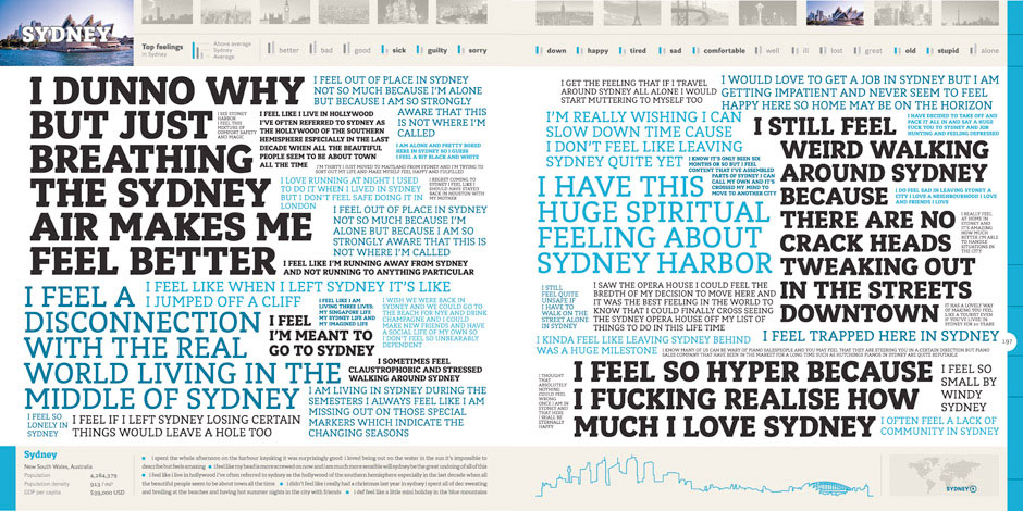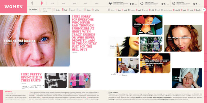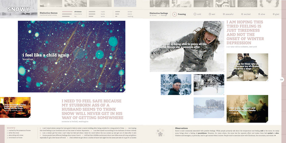 そしてプロジェクトがスタートして4年以上経過した今年(2009年)12月1日、これまで蓄積され続けた人々の感情のデータを様々な視点から検証、分析した本『We Feel Fine: An Almanac of Human Emotion』がリリースされた。288ページの本には、1000人以上から集められた写真や130万もの『想い』のデータをビジアライズしたもの、人々の日常の物語が綴られた文章などが含まれている。エディトリアルデザインも素晴らしく、他のページも公式サイトから見ることができる。日本語に翻訳されたものは出版されていないが、英語版をAmazonから購入することが可能。