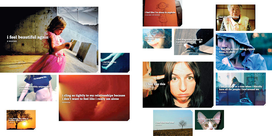ブログなどのウェブサイト上で、感情の表現に使用される「I feel」 と 「I am feeling」が使われている文章を検索、収集しデータベースに蓄積、その膨大なデータを視覚化する試み『We Feel Fine』。Jonathan Harris と Sep Kamvarによる同プロジェクトは2005年8月にスタートし、一日に15,000 - 20,000の新たな感情が追加され、今もなおオンライン上のデータを蓄積し続けている。サイト上のアプレットを立ち上げれば人々の様々な感情表現が、美しくデザインされたビジュアルと共に閲覧することができる。