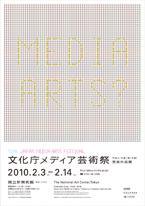 今年で13回目を迎える文化庁メディア芸術祭がいよいよ、2月3日(水)から国立新美術館にて開催される。今年の応募数は国内外から2,592作品、前年比121%と5年連続の記録更新となる。特に海外からの応募が26%と急増、世界的な注目の高さが伺える。