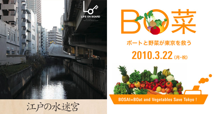 もう一方は『BO菜 - ボートと野菜が東京を救う』と題した水上サバイバルピクニック。船(=BOAT)に東京湾の対岸で取れた野菜(=菜)や海産物を載せて東京へと運搬し、さらにその野菜を、東京の運河を使って都内へと輸送するという試み。このイベントを通じて、東京の水辺を楽しみながら防災への意識を高めてもらうというのが目的だ。