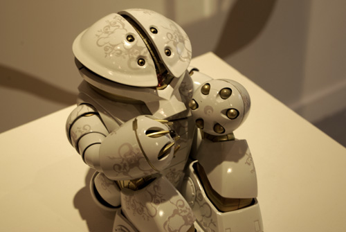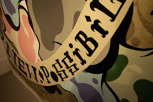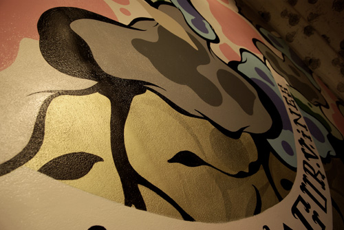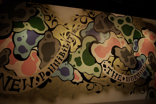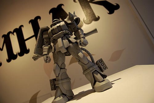 今回の展示は、moshi-moshi gallery(ポートランド)で4月に開催された個展と同じテーマ"New posshibilitie and curvines"のもとに、キャンバスの作品群展示ではなく、ギャラリーの壁画へのペイントとモデラーとのコラボレーションによるガンプラが展示されていた。