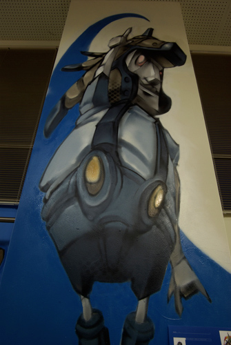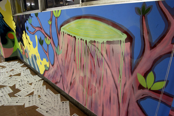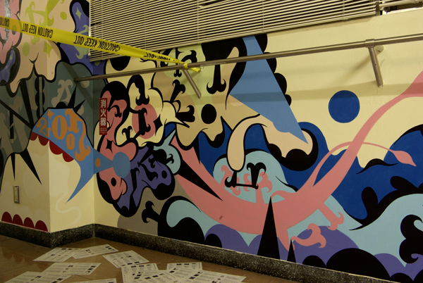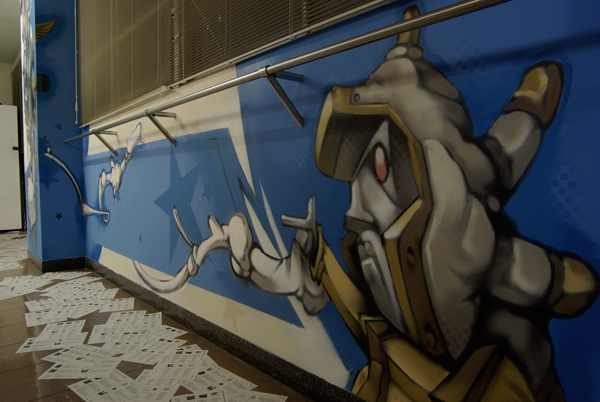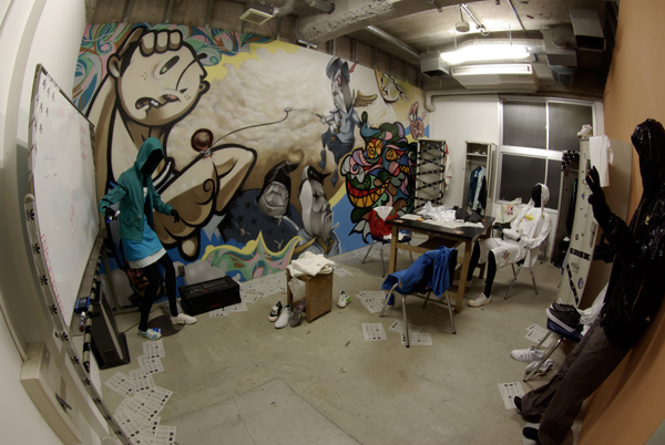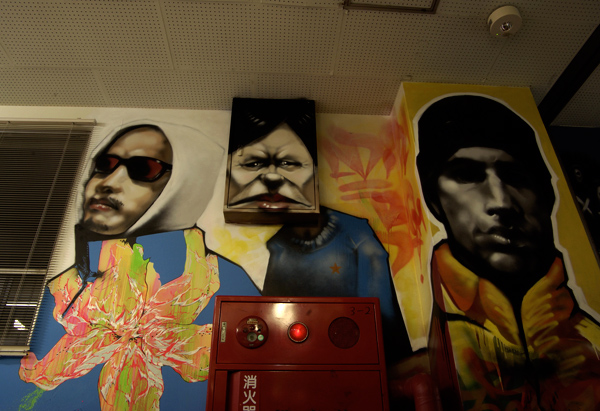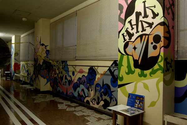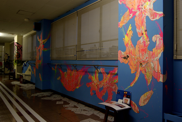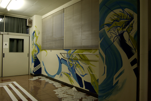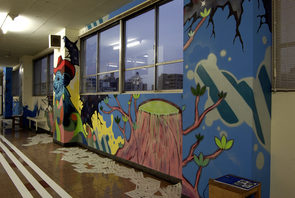 「授業」が行われた各教室・廊下には、ものづくり学校に入居している様々なジャンルで活動しているアーティスト・デザイン会社・クリエイターが「課題発表」や「講義」というカタチで演出を手掛けた。今回はorb-itのコーディネーションで実現した1F会議室と3F廊下で展開した6名のペインター/ライターの壁画をフォトスライドでお届けする。