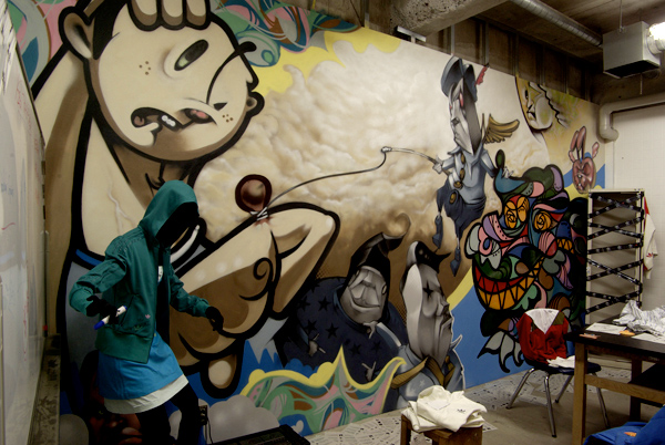 1977年埼玉県生まれ。日本のGraffiti writerでは数少ないキャラクター描き。TENGAの描くキャラクターは、古典的なGRAFFITIの面影を残しつつグロテスクで写実的な描写力、