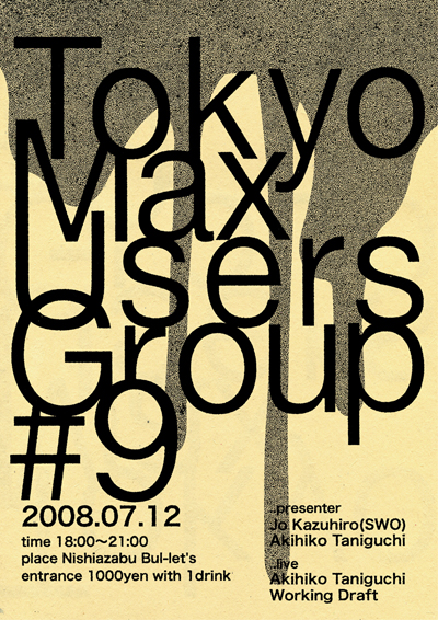 二ヶ月に一度定期的に開催される、Max/mspユーザーが集うAudio/Visualのプログラミングに関する情報交換を目的としたゆるやかなイベントTokyoMaxUsersGrouの9回目。