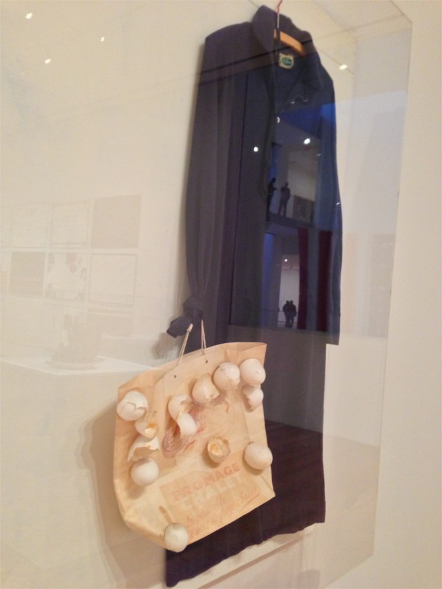 こちらは難しいオブジェクトですが、生卵の殻と服がアクリルで見事に額装されています。