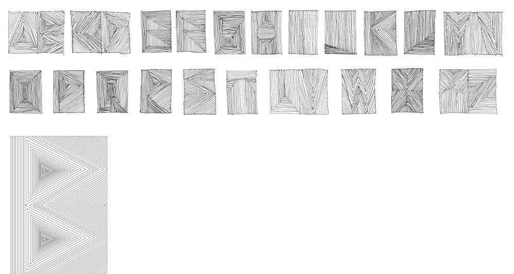 コンセプトが切られ再考される。文字、素材が持つ意味、それ自体が飯田の作品を作品化する為の意味を表しています。飯田の作品自体を解体、再構築はできませんが、一度文字に置き換え、共有される媒体項としての本に戻す事で、それ自体が「意味をもう一度持つ」事になります。そしてそれらが、アルファベットとして再構築される。しかも用途(文章)としての意味も付随する事ができるタイプフェイスとして。自分の作品が表現の領域から、デザインとしての定着の領域に達した瞬間でした。