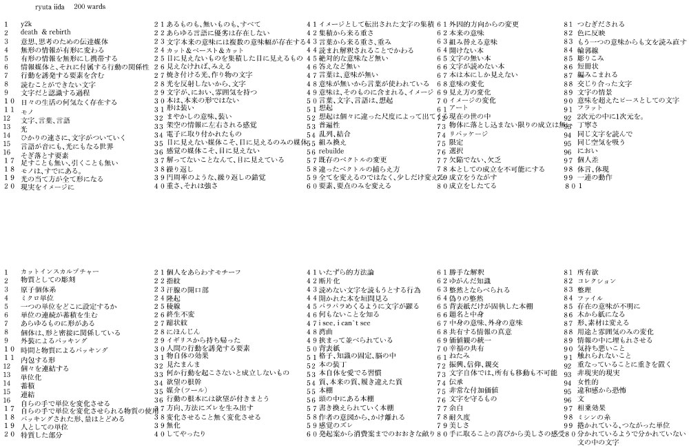 この本は、oratorycal typeの制作の為に作られた本です。本の著者は飯田です。この本に記載されている内容は、今まで飯田が制作してきた作品のコンセプトに用いられている単語が、1〜15文字程度に分解、単語化され、繰り返し記載されています。