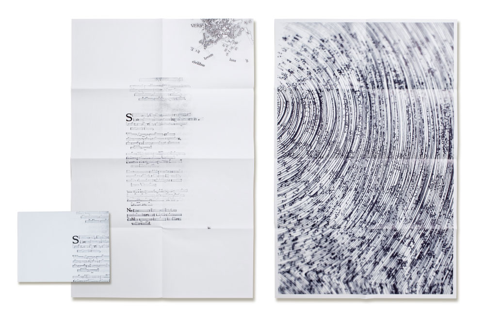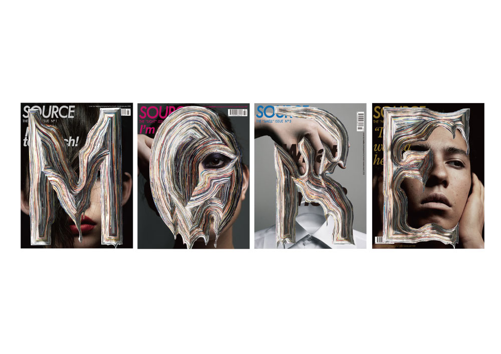 デザインされた文字の最小形態を引き出し、まず表紙からレイヤーを彫り込みます。カットされ切り離された紙の破片は同形態のまま整形され同位置の裏面に貼付けられます。裏面に張られた「表紙から切り取られた形状(盛り上がっている)」を基軸に、そのまわりにレイヤーを彫り込んで行きます。またそこでカットされた切り離された紙の破片は同形態のまま整形され表紙に貼付けられます。