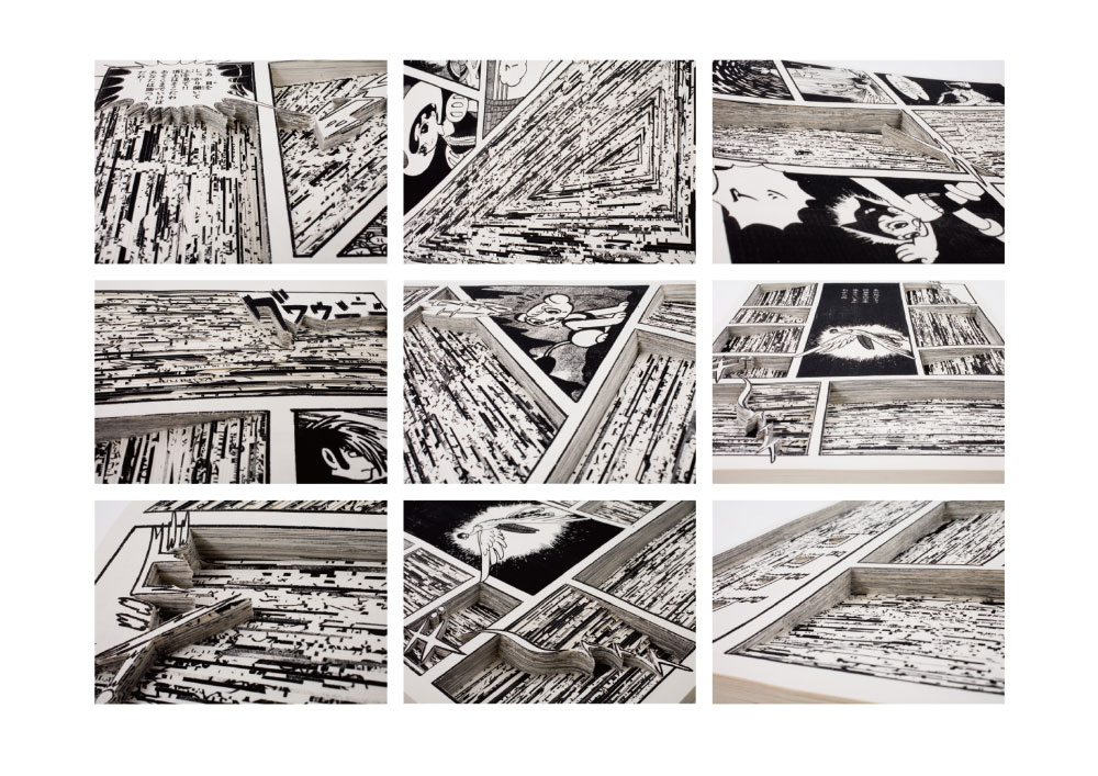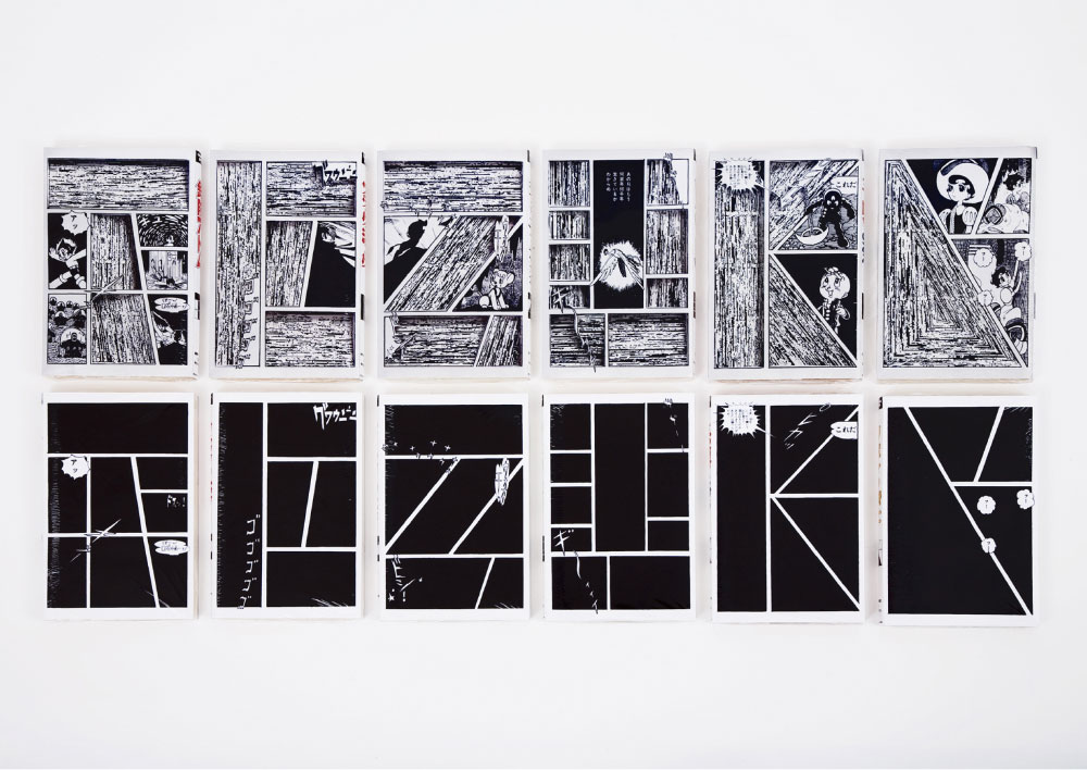 [T E Z U K A]の6文字それぞれに、手塚治虫の漫画が割り当てられています。それぞれの文字の窓にあわせられるように、漫画を読みあさり形に合った窓を探し、極力デザインしないようコマ分けをしました。サイズは掲載当時のオリジナルサイズを用い、紙もなるべく掲載当時に近づけるため週刊誌で使われていたものを使用。漫画のページを一枚一枚スキャンし、プリントにかけ、世界に一つだけの切る為だけの手塚治虫の漫画本を作りました。
