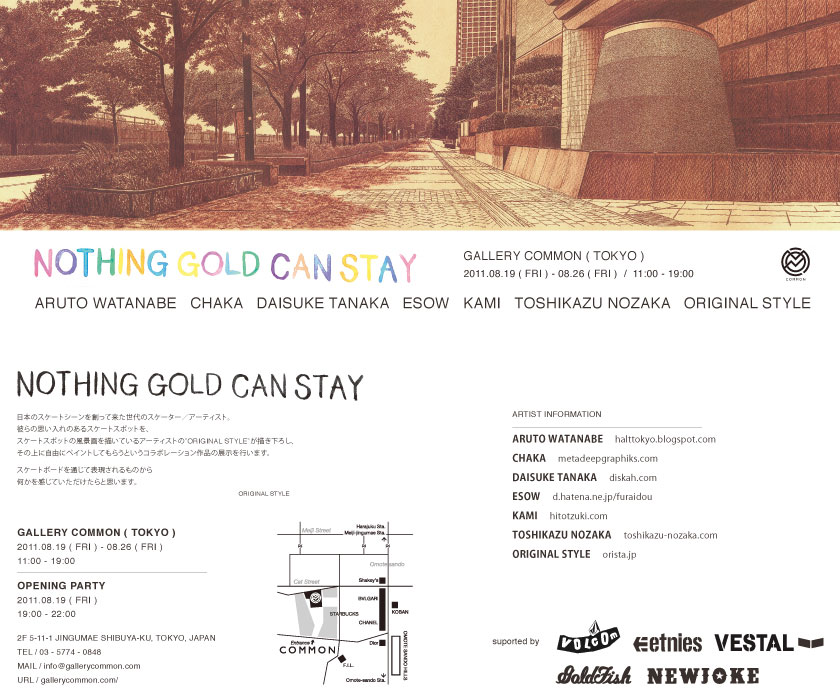 スケートスポットの風景画を描いているアーティストのoriginalstyleによる展示「NOTHING GOLD CAN STAY」が、原宿のギャラリーCOMMONにて8月19日より開催される。