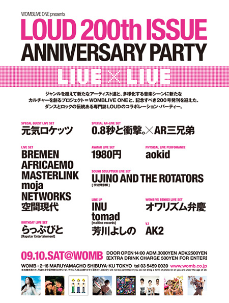 ジャンルを超えて新たなアーティスト達と、 多様化する音楽シーンに新たなカルチャーを創るプロジェクト『 WOMBLIVE ONE』と、記念すべき200号発刊を迎えた、ダンスとロックの伝統ある専門誌『LOUD』のコラボレーション・パーティーが9月10日、渋谷 WOMBにて開催される。