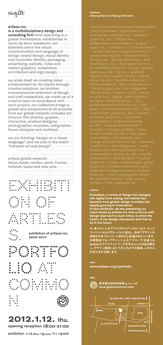artless Inc. は、多彩なクリエイターから各プロジェクトに応じて最適なチームを編成し、ビジネスを発展させる様々なコミュニケーションデザインを行っている。ジャンルに縛られない幅広い活動は、世界各地でD&ADやカンヌ国際広告祭ブランドデザイン部門での金賞、NY ADC、One Show、Tokyo TDC等での数々の受賞にて高く評価されている。