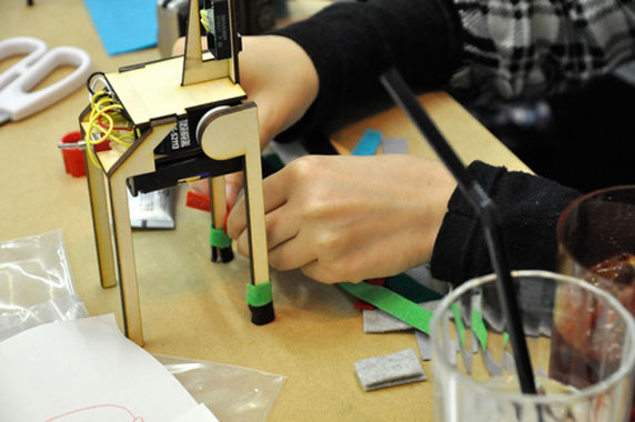 電子工作と手芸を組み合わせた「テクノ手芸」という新しい工作活動を行っているテクノ手芸部を講師に招き、センサーやモーターを使用した、キリン型の動くロボットを制作する。