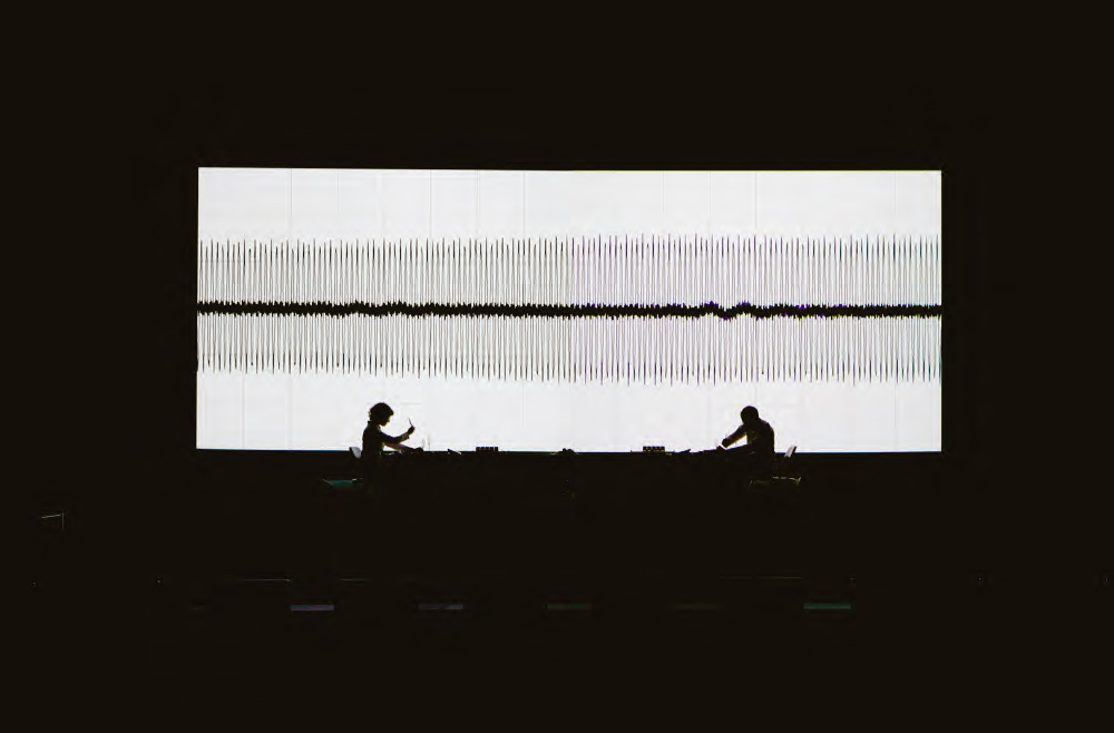 超低音波を用いるのは、人々の動揺を掻き立てるためだろうか。ここに、池田のテクノロジーと人間の関係に対するメッセージが込められている。実際、本作では池田の作品では初めて、生身の人間が登場する。ステファン・ギャランとアメリ・グルウが、舞台上に置かれた長い机の両端からモールス信号でスクリーンにメッセージを送ったり、音叉を用いて音波をスクリーン上に視覚化したりする。イメージとサウンドの速度が一緒になって加速する中、人間の存在が尺度のバロメーターになっている。スクリーン上に無数の閃光がうごめく渦中にあって、2人のパフォーマーは地に足がついているとみるか、情報の波に押し流されているとみるかは、みる人次第だろう。