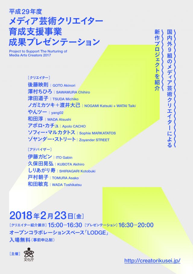 平成29年度に本事業に採択された国内外9組のクリエイターが行った作品制作の成果報告として「成果プレゼンテーション」を開催される。本イベントでは、採択されたクリエイターによる作品のプレゼンテーションが行われるほか、アドバイザーを交えて作品制作過程などが語られる。
