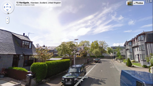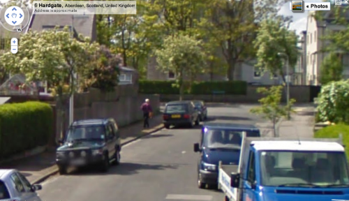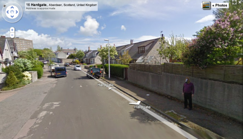 【スコットランドの平穏な住宅街にいる、おそらく60,70歳以上の方がこのかぶりものを持って、グーグルカーを知っており、いつ登場するかわからないそれに気づき、後方から走ってくるその車に合わせて、その仮面をかぶり、通り過ぎたら後ろ姿になっている。】