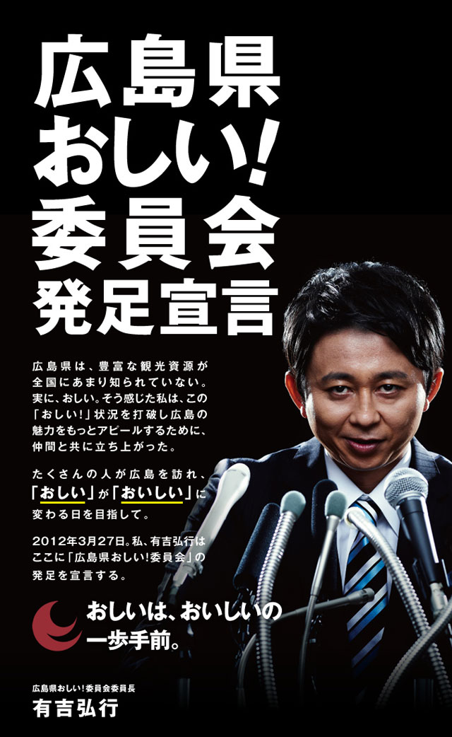 広島県の新たな観光キャンペーン。うどん県(またはアート県)に続き、有吉弘行をフィーチャーし、同様のアプローチの内容。