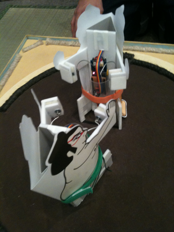 Craftive「とんとん、すもったー」は、リアルタイム実況システム付きのとんとん相撲システム。力士の取組み状況や勝ち負けが土俵のすぐ横に表示され、実況がtwitterに流れる。(行司は人間)こちらも子どもに大人気。