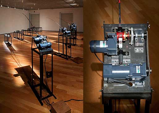 “何も釣らないフィッシングマシン。鉄の台車のキャッチとリリースを繰り返す。そのロッドとリールの純粋な性能を提示。竿はしなやかにしなるために、リールは巻き上げるためにある。”