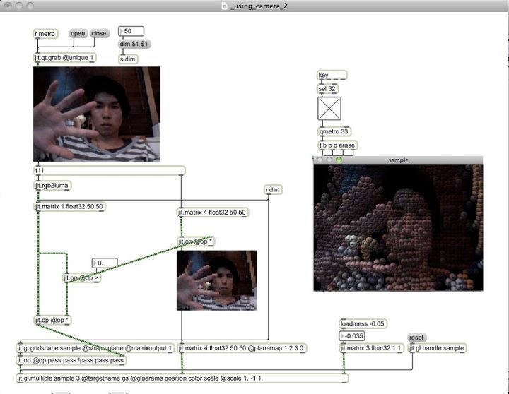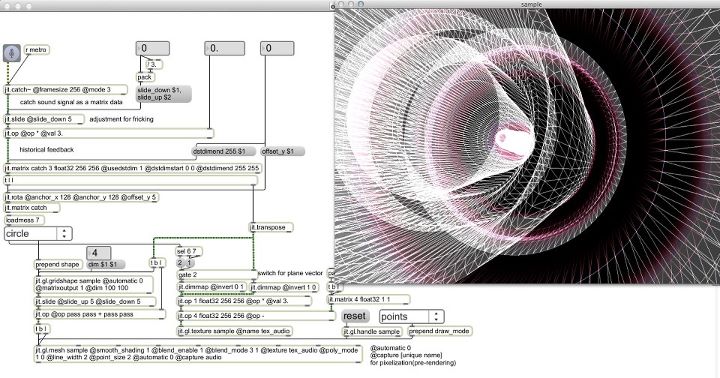 ワークショップ初日は筒井氏によるOpenGLを用いた映像のためのプログラミングが題材となった。OpenGLは3次元のコンピュータグラフィックスのためのオープンな仕様であるフリーのライブラリである。当然ソフトウェアとしては後発であるMax/MSPを介さずにプログラムを作ることもできるが、これをMax/MSPのようなヴィジュアルプログラミング環境で構築していけるメリットはプログラミングを専門としていないアーティストには大きい。筒井氏はMax/MSP内部でOpenGLを扱うスペシャリストであり、このレベルでOpenGLを活用している例は世界でも類を見ない。映像のみならず音を専門領域とするMax/MSPワークショップ受講者にとってもOpenGLという新しい表現領域に手軽に踏み出す一歩となったのでは無いだろうか。オーディオリアクティブな映像