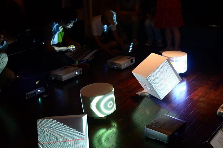 Max/MSPで画像を三次元的に変形させてから出力する方法を学んだ後は参加者全員で発泡スチロールで作られた物体にプロジェクションマッピングを行った。プロジェクションマッピングとは映像をスクリーンではなく様々な物体に投影するという技法でメディアアートのみならず広告分野などでも今最も注目を浴びている映像表現の一つである。これをMax/MSPから実行している例も筒井氏以外には聞いたことが無く、参加者にとっては貴重な機会となったであろう。