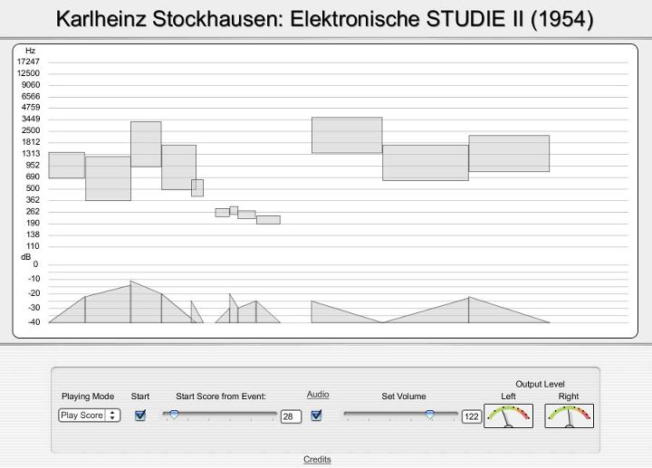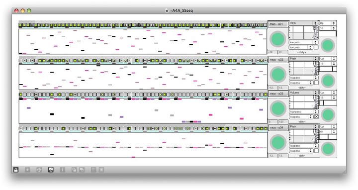 電子音楽がアカデミックであった時代に巨大なシステムを使って作られていた先鋭的な作品の実例として、シュトックハウゼンの電子音楽作品の紹介が行われた。音楽にはリズムがありメロディーがありハーモニーがあり、形式的な構造があるという約束事があるが、音楽を物理的な要素まで立ち返り、音階やメロディー以前の周波数、リズムという以前の時間、音色という以前のスペクトルと捉えて新しい音楽の可能性を追及したシュトックハウゼンは電子音楽黎明期の重要な作曲家であろう。尚、このパッチはMax/MSPのサンプルに含まれており、誰でも編集、実行をすることが可能だ。その他、スティーブライヒのピアノフェイズ、ブライアンイーノのジェネレーティブミュージックのシミュレーション、Maxをオーディオ領域で扱えるようになった90年代以降にFMシンセシスを応用したオウテカの事例、フェネスが多用したグラニュラーシンセシス、超複雑にパッチングされギリギリのCPUで動いていたSILICOMのシーケンサーパッチ、そしてevala氏自身が制作したMaxのパッチが紹介された。こうして時系列で並べてみると音楽の多様性と同じくらいMaxパッチにも様々なものがあり、DAWでは実現不可能なことが多々ある音楽ソフトとしてのMax/MSPの可能性を垣間みることができたであろう。