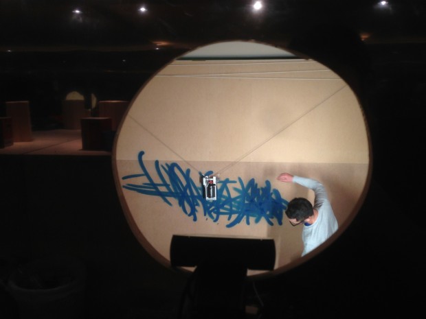 シアターの1階になぜかジャクソン・ポロック推しのバーがあって、そこの空間にインスタレーションつくってっていうのと、会期中にパフォーマンスやってっていうのが今回Gonzoにきたオーダーのようです。で今週末、土日で最初のパフォーマンス。自分はそのパフォーマンス中にバネで吊るタイプのドローイングマシン動かしたり、リアルタイムに録画した映像の時間軸操作しながら再生する簡単なソフトつくってVJ的にプロジェクションしたり。