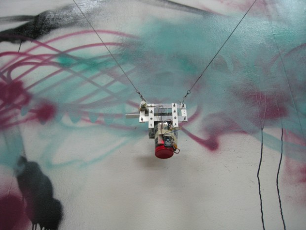 スプレー缶のガワ制作2日目@メディアラボ。 で、ある程度形になったので、FIO+Xbeeをテープでぐるっとくっつくけて深夜アトリエでテスト。 バネで吊っていて描画結果がリサージュ曲線になります。